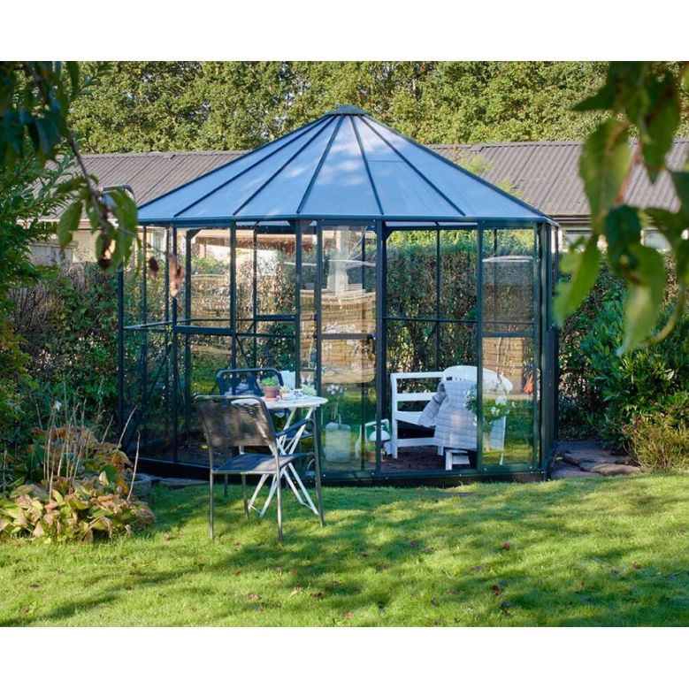 The pavilion is furnished with double sliding doors and three opening side windows for extra ventilation, so you will feel as if you are actually sitting outside in the garden, but with the added bonus of being sheltered from the weather and surrounded by your plants.
