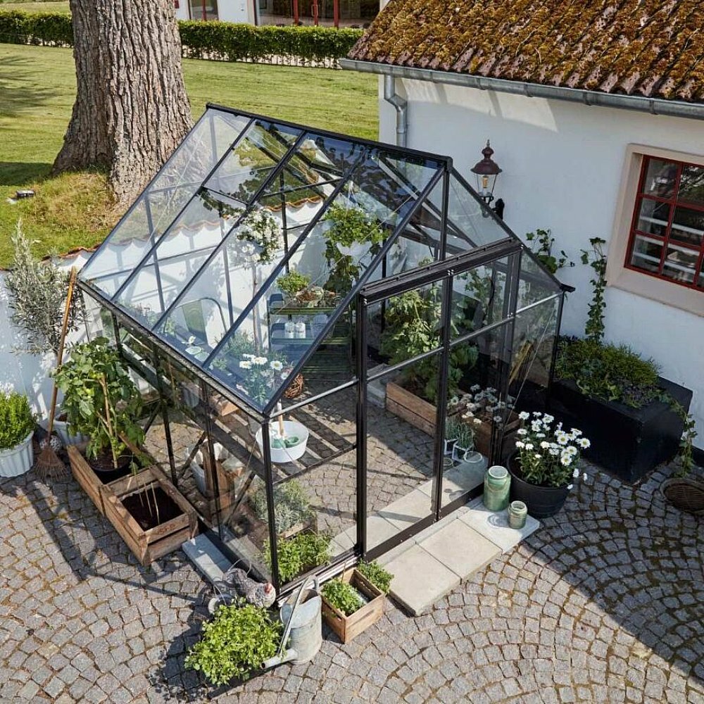 This Halls Qube+ greenhouse is particularly well suited to patios, paved bases, and structured gardens where workable width matters more than overall length.