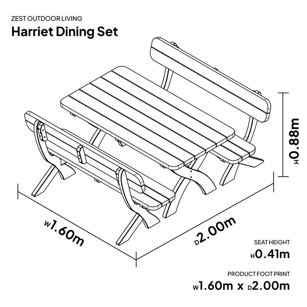 Delivered flat-packed with easy assembly instructions, this set is designed for straightforward setup so you can start using it quickly. Whether you’re hosting friends or enjoying a quiet meal outdoors, the Harriet Table and 2 Bench Set blends classic aesthetics with all-day comfort and long-lasting performance.