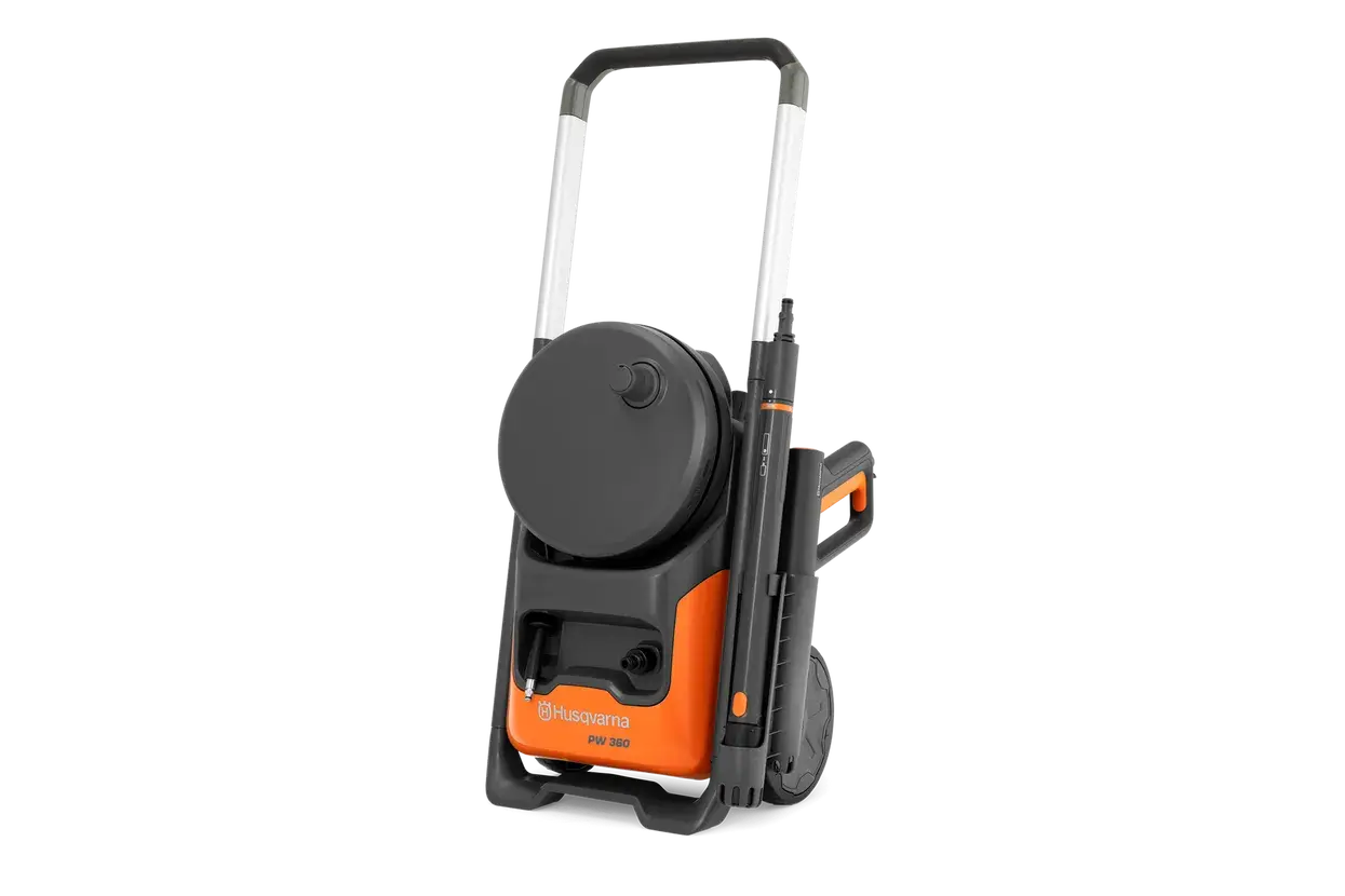 Designed with convenient onboard storage so you have everything you need within easy reach. The PW 360 is compatible with several accessories, and to easily get the optimal setup for each task, nozzle and pressure guides are available on the washer. When the job is finished, roll-up is done quickly using the hose reel with support guide, providing efficient hose storage. The pressure washer also features large soft tread wheels for great traction in demanding terrain, low force trigger gun, and foldable aluminum handle to reduce the space needed for storage.