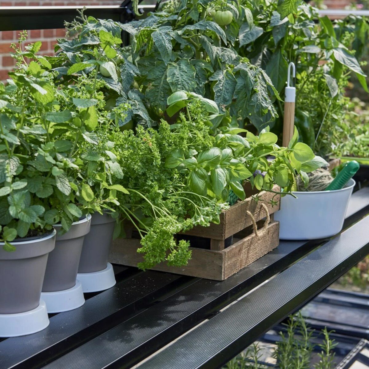 Once installed, the staging also acts as a bracing component, adding rigidity to the Halls Qube Square Greenhouse against movement and wind. This contributes to a more settled feel in exposed conditions and reduces flex through the structure over time. The black powder-coated aluminium finish resists corrosion in humid greenhouse conditions, so you don’t have to deal with swelling timber, flaking paint, or ongoing surface treatment.