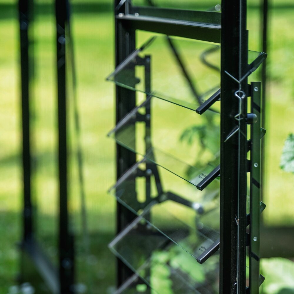 The aluminium frame is finished with a black powder coating to complement the modern appearance of black ICON greenhouses. This finish allows the louvre to integrate cleanly with the structure while also providing added resistance to corrosion, chipping, and fading over time.