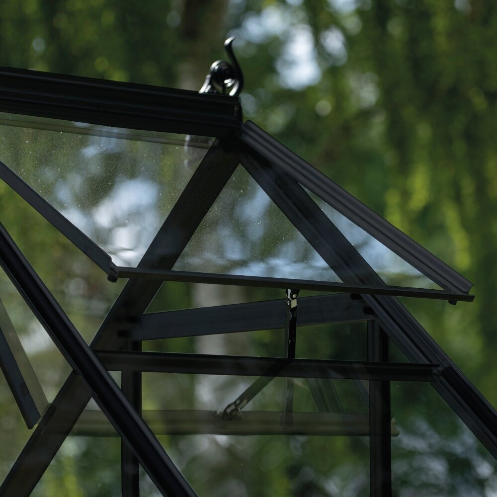 Halls Icon 6 6x10 greenhouse with black powder-coated finish and toughened glass