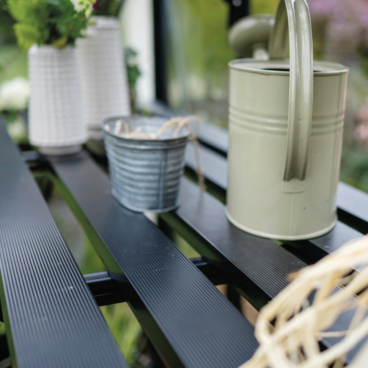 Finished in black with a powder-coated metal frame, the slatted benching encourages airflow and drainage to help reduce condensation, mould, and waterlogging. A full-length lower shelf provides useful storage for trays, compost, watering cans, and tools, keeping essentials close at hand without cluttering the floor. Designed as part of the ICON modular accessory system, this folding staging creates a flexible workspace that adapts to seasonal growing demands.