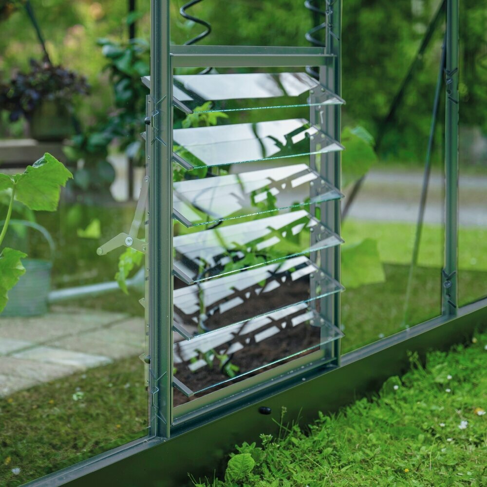 Constructed from aluminium with toughened glass louvre blades, the unit is supplied in a mill (natural aluminium) finish as standard, with optional black or green powder-coated finishes available to match different Halls ICON planthouse and lean-to frame colours. This allows ventilation to be integrated visually as well as structurally, maintaining a consistent finish across the build.