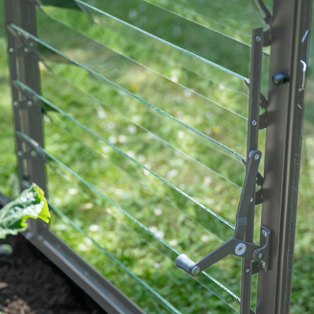 Designed specifically for compatibility with the Halls ICON planthouse and lean-to range, the louvre installs neatly into the structure and integrates cleanly with the aluminium frame. Its position supports balanced airflow without creating drafts, making it well-suited to protected growing, propagation, and overwintering environments. The louvre can be operated manually or, for added control and ease, paired with an automatic louvre opener to ensure ventilation responds to internal temperature changes without constant adjustment.