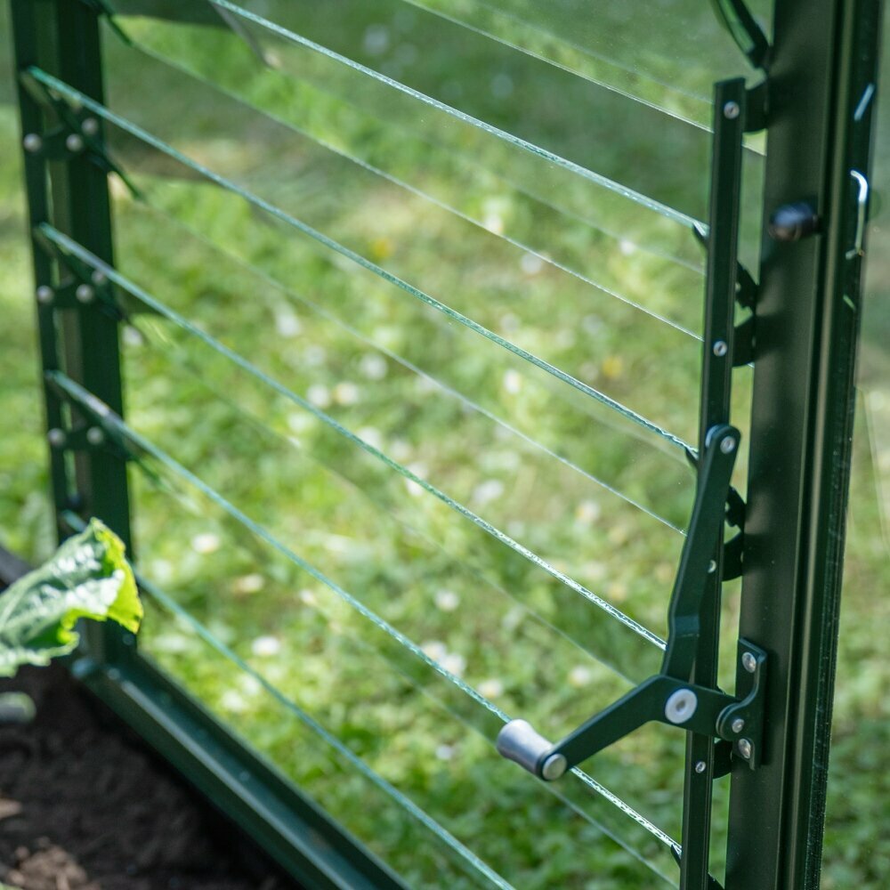 Designed specifically for compatibility with the Halls ICON planthouse and lean-to range, the louvre installs neatly into the structure and integrates cleanly with the aluminium frame. Its position supports balanced airflow without creating drafts, making it well-suited to protected growing, propagation, and overwintering environments. The louvre can be operated manually or, for added control and ease, paired with an automatic louvre opener to ensure ventilation responds to internal temperature changes without constant adjustment.