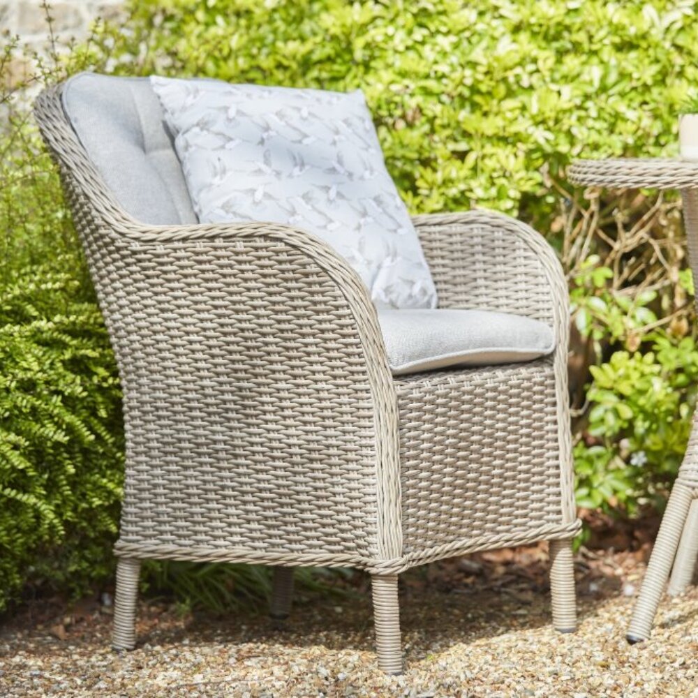 Leisure Grow St Tropez Sand 2 Seat Garden Dining Set is a compact rattan bistro set designed for patios, balconies, and smaller garden spaces. Handwoven all-weather poly-rattan with an authentic wicker look is finished with subtle twisted rod weave detailing and built around a lightweight, powder-coated aluminium frame for easy positioning outdoors. UV-resistant materials help maintain the soft sand tone over time, while season-proof cushions use stain-resistant fabric with environmentally friendly EcoCore filling. The round dining table is topped with strengthened, ceramic-coated, wood-effect safety glass for everyday outdoor use.