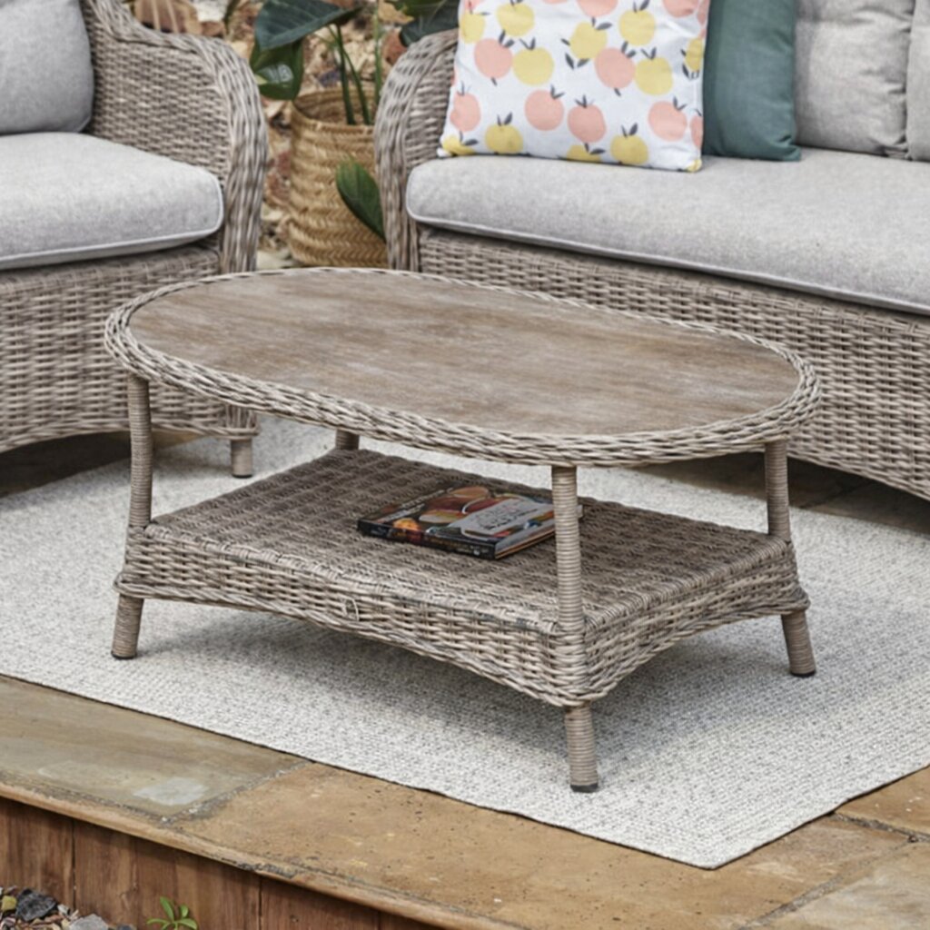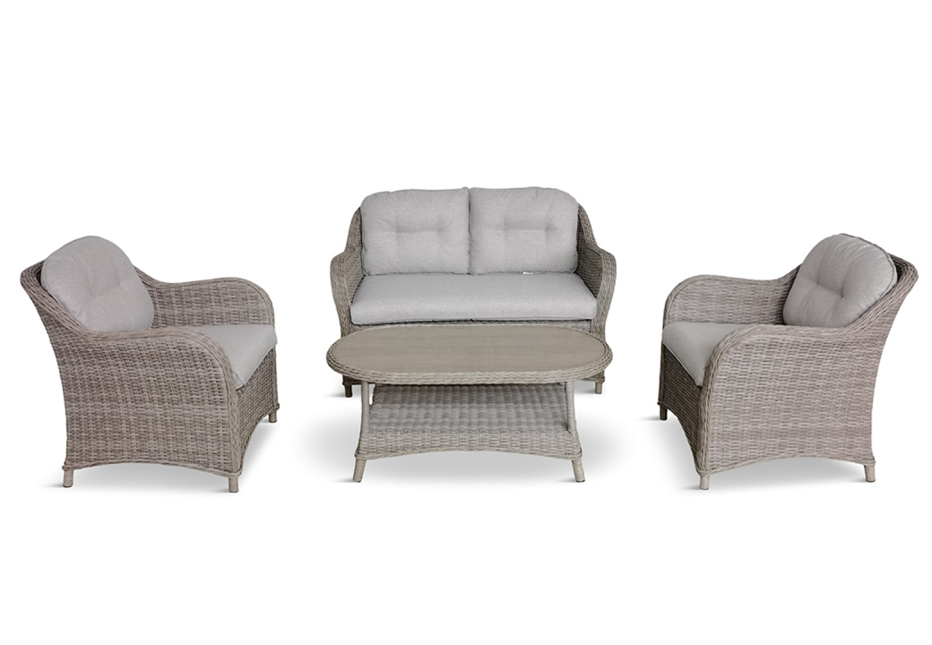 Leisure Grow St Tropez Sand Garden Sofa Lounge Set is a comfortable rattan seating set designed for patios, terraces, and relaxed outdoor living areas. Handwoven all-weather poly-rattan with an authentic wicker appearance is finished with subtle twisted rod weave detailing and built around a lightweight, powder-coated aluminium frame for durability and easy repositioning. UV-resistant materials help maintain the soft sand colour over time, while season-proof cushions feature stain-resistant fabric with environmentally friendly EcoCore filling for lasting comfort. The coordinating coffee table is topped with strengthened, ceramic-coated, wood-effect safety glass, making the set suitable for everyday outdoor use.
