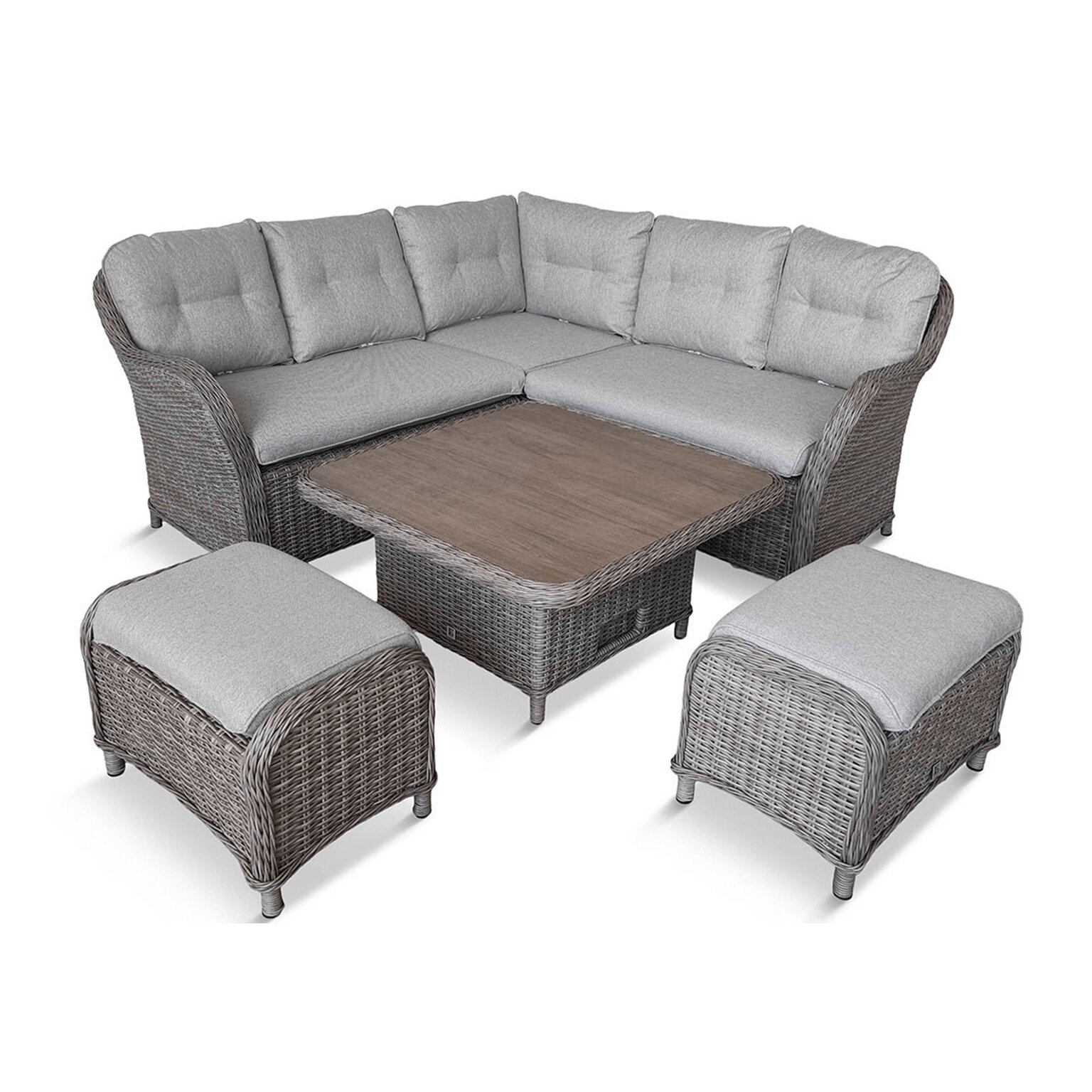 - Includes corner sofa, two stools, and adjustable-height dining table