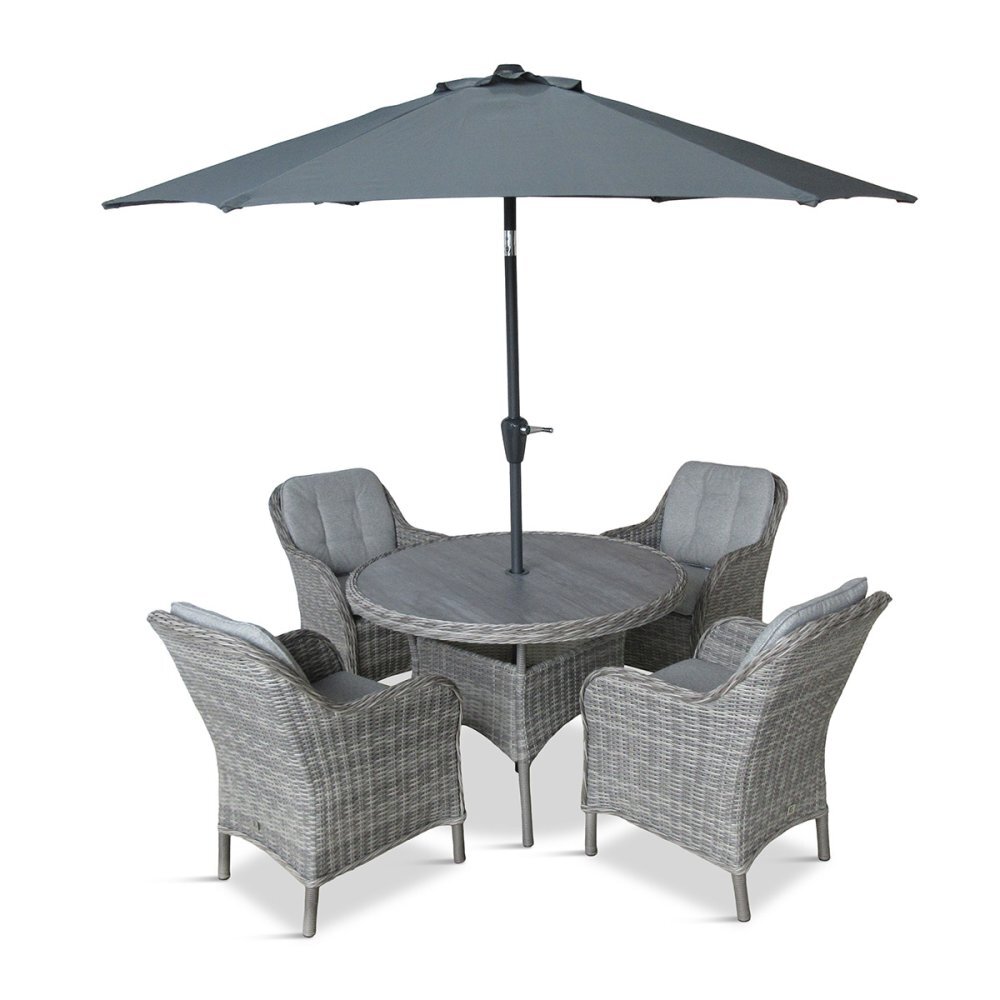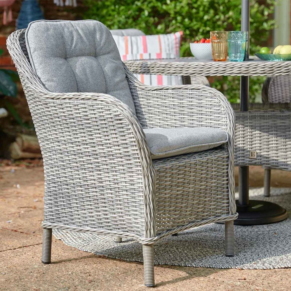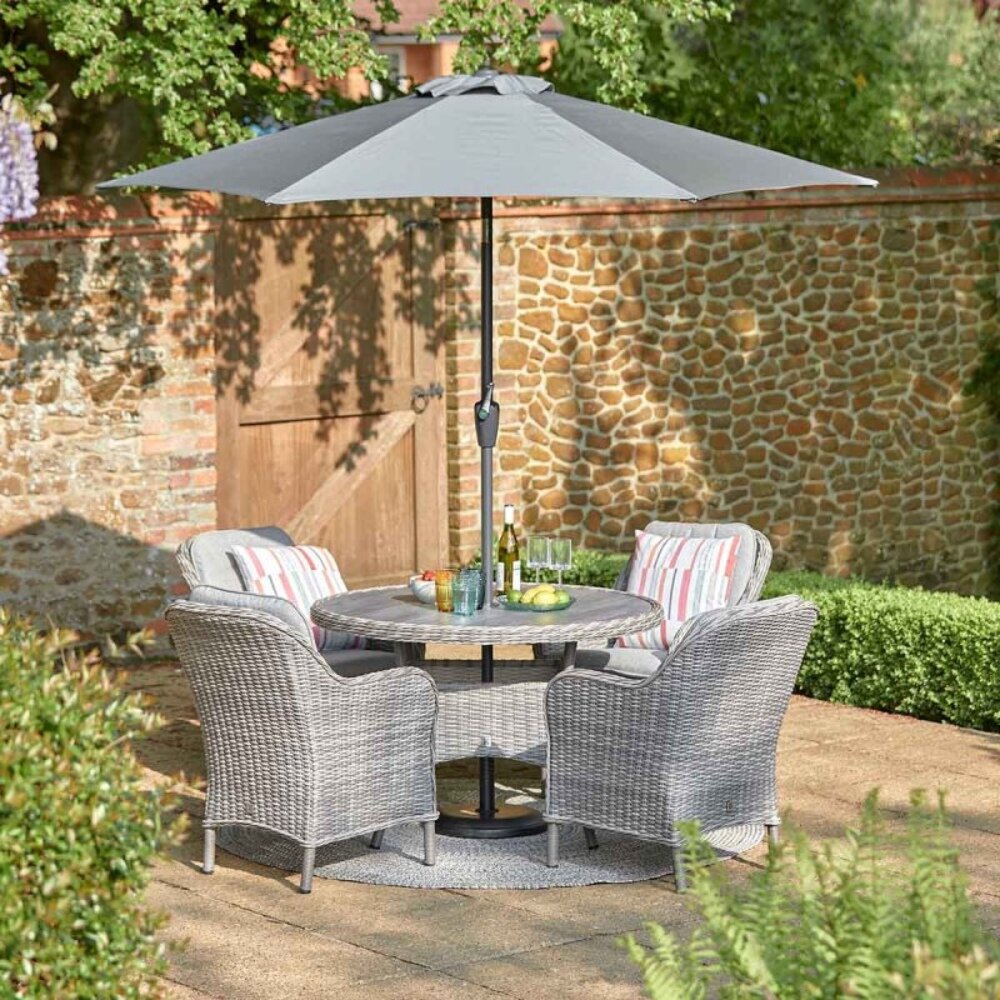 The LeisureGrow St Tropez Stone 4 Seat Garden Dining Set with 2.5m Parasol offers relaxed outdoor dining for four without overwhelming patios or garden spaces. Round-back chairs are handwoven in all-weather poly-rattan with an authentic wicker look and subtle twisted rod detailing. A lightweight, powder-coated aluminium frame keeps the set easy to move, while UV-resistant materials help maintain the stone finish. Deep, season-proof cushions feature stain-resistant fabric with EcoCore filling and removable zip covers. The table is finished with strengthened, ceramic-coated, wood-effect safety glass.
