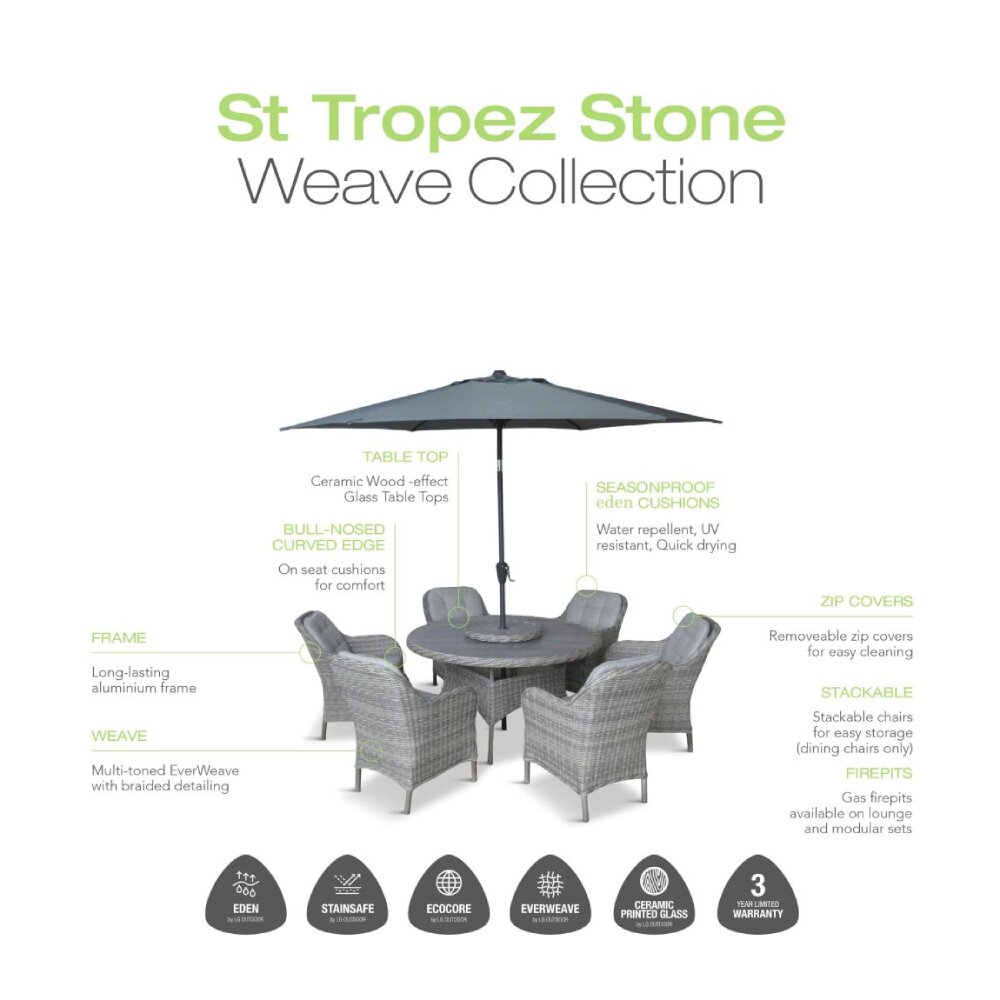 Are you looking for the product "LG St Tropez Stone 4 Seat Dining Set & 2.5m Parasol STST/SET2"? We offer this product in our garden centre in Pickering, North Yorkshire. You can order the product "LG St Tropez Stone 4 Seat Dining Set & 2.5m Parasol STST/SET2" online or you can visit our garden centre in Pickering, North Yorkshire or for more information about the product "LG St Tropez Stone 4 Seat Dining Set & 2.5m Parasol STST/SET2". We look forward to seeing you soon!