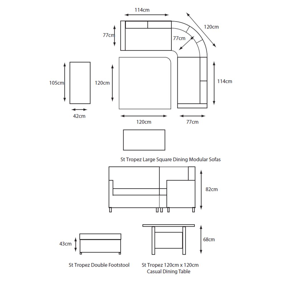 The LG St Tropez Sand Large Square Modular Sofa Set & Table is designed for relaxed outdoor dining and sociable seating in larger garden spaces. Its square modular layout combines a corner sofa with two matching benches, creating a flexible arrangement that works equally well for lounging or casual dining. Handwoven all-weather Everweave poly-rattan in a soft sand tone delivers an authentic wicker look, finished with refined twisted rod detailing and supported by a lightweight, powder-coated aluminium frame. UV-resistant materials help maintain colour over time, while deep, season-proof cushions use stain-resistant fabric with environmentally friendly EcoCore filling for lasting comfort. The 120x120cm dining table is topped with strengthened, ceramic-coated, wood-effect safety glass for a durable, low-maintenance outdoor surface.