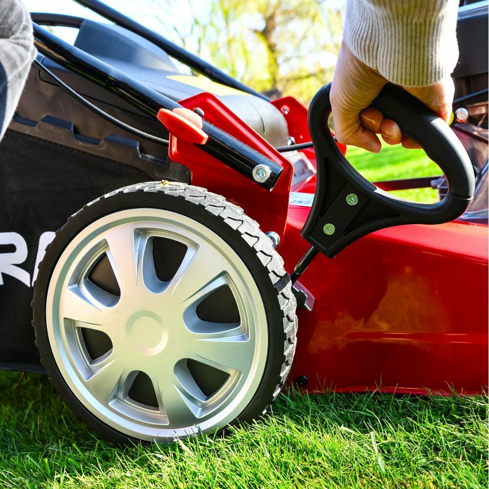 The advanced Vortex Airflow collection system improves grass lift and internal airflow, helping capture fine clippings and reduce clogging when cutting thicker or slightly damp grass. A 46cm cutting width offers a practical balance of coverage and manoeuvrability, making it well-suited to homeowners comparing 18" petrol lawn mowers for medium lawns.